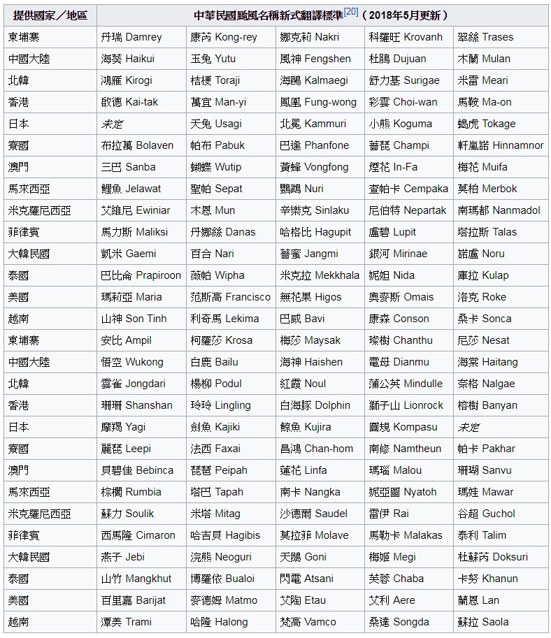 虽然台湾每年都会被无数个台风影响,中央气象局针对台风的命名几乎也和全世界一样,但其实台湾并不是台风委员会的会员 (因联合国决议的关系) ,因此只能只用另行翻译的中文译名,也没有办法提供台风名字或是要求除名。