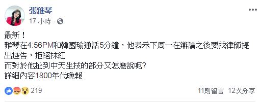 在留言中所提及的主播張雅琴,於昨日 (15日) 在臉書上為自己澄清,並且貼出原來新聞片段,證明自己並未提出關於韓國瑜曾就讀中共北京大學光華學院博士班一事,隨後在一小時內再次發文表示自己已和韓國瑜進行五分鐘對話,且韓國瑜也即將提告,讓刻意造謠的背後生事者付出代價。另外,對於鄭弘儀在陳其邁旗山場合造勢會場所說的「韓國瑜當選高市長,搞不好我們會被他賣掉。」不排除將一併提告,藉此表示自己拒絕抹紅。