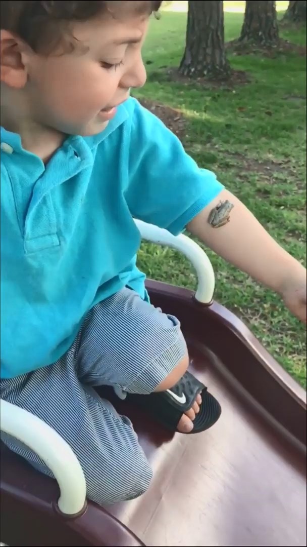 從影片中可見,這名來自美國猶他州的小男孩當時候一邊哭一邊看著他左手臂上的小青蛙,期間他還一直哭喊著要媽媽幫忙把小青蛙趕走,媽媽當下忍不住笑著問他「你為什麼要玩青蛙呢?」,就在媽媽出手幫忙並用手指撥開小青蛙時,小青蛙竟然立馬跳到男孩的臉上,甚至靠近他嘴巴的位置,這個時候小男孩又被嚇得馬上爆哭。