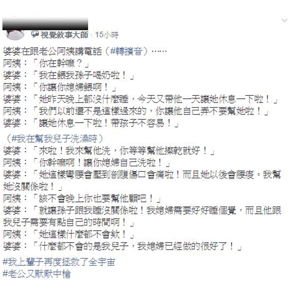 原PO在「爆廢公社」貼文表示,她的婆婆幫忙餵孫子喝奶時接到了老公阿姨的電話,於是便開擴音聊天,當對方知道婆婆目前正在幫忙餵奶時便直言這些其實應該是媳婦要做的事,並表示「妳讓妳媳婦餵啊」、「我們以前還不是這樣過來的,妳讓她自己弄不要幫她啦」,只見婆婆立馬回應表示媳婦前一晚沒什麼睡到加上今天又帶了孩子一整天,所以希望讓媳婦休息,她更提到帶孩子很不容易。