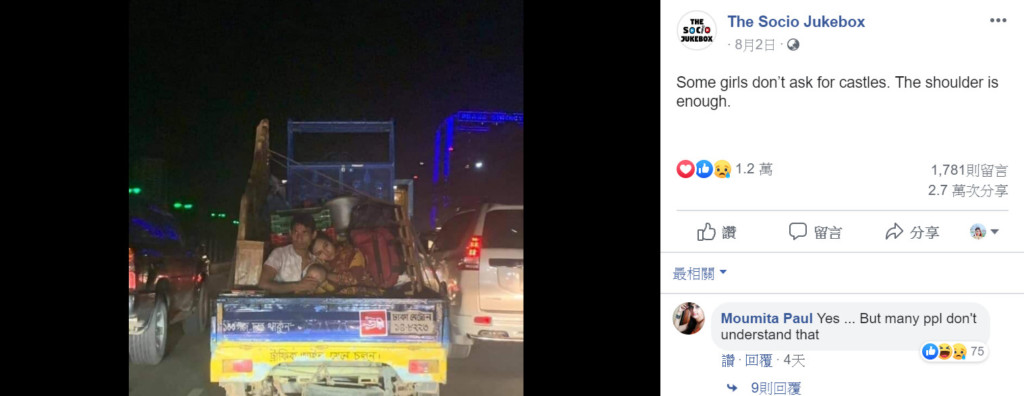 這張照片發佈至今,已經累積了2.7萬則分享。當地網友推測,這對夫婦看起來不像是富裕人家,而且可能是新婚不久,正準備搬家。雖然目前他們的身份不明,但這張照片的滿滿愛意與溫暖,感動了無數網友。不少人紛紛留言表示:「可惜很多男人不知道這一點」、「男人最重要的就是有肩膀」、「希望他們可以幸福」。