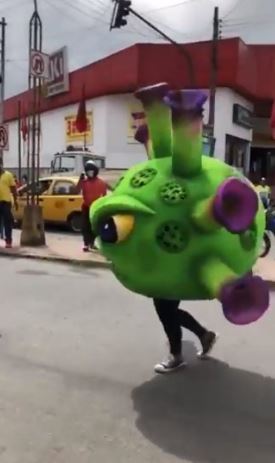 日本網友在推特 (@Yurukuyaru) 上發了一部影片「在厄瓜多,如果你沒戴口罩的話就會這樣。」影片一開始就看到一個男子被4個壯漢抬起來,然後被當棺材跳抬棺舞,而且旁邊還有一個綠色的武漢肺炎 (又名新冠肺炎) 造型的娃娃,一臉兇狠的旁邊跳舞。