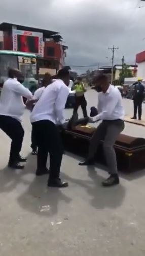 被當成棺材抬的男子不知道是太羞恥還是被抬到昏頭,剛被放到地上時感覺整個人恍惚,還繼續躺著 (或者他其實很享受被抬的感覺??) 總之,直到警察朝他走過去,他楞了一秒才從地上爬起來,然後戴上警察給的口罩。