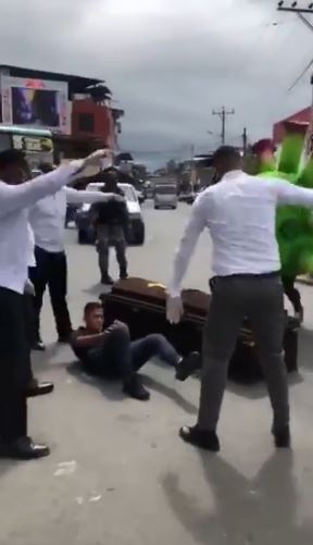 雖然現在很多人都開始不戴口罩,不過疫情還沒結束,大家千萬不能鬆懈。最近厄瓜多人想出了一個超有效勸民眾戴口罩的方式,那就是直接把不戴口罩的路人抓來強迫跳抬棺舞,不過路人擔任的是「棺材」這個角色……。