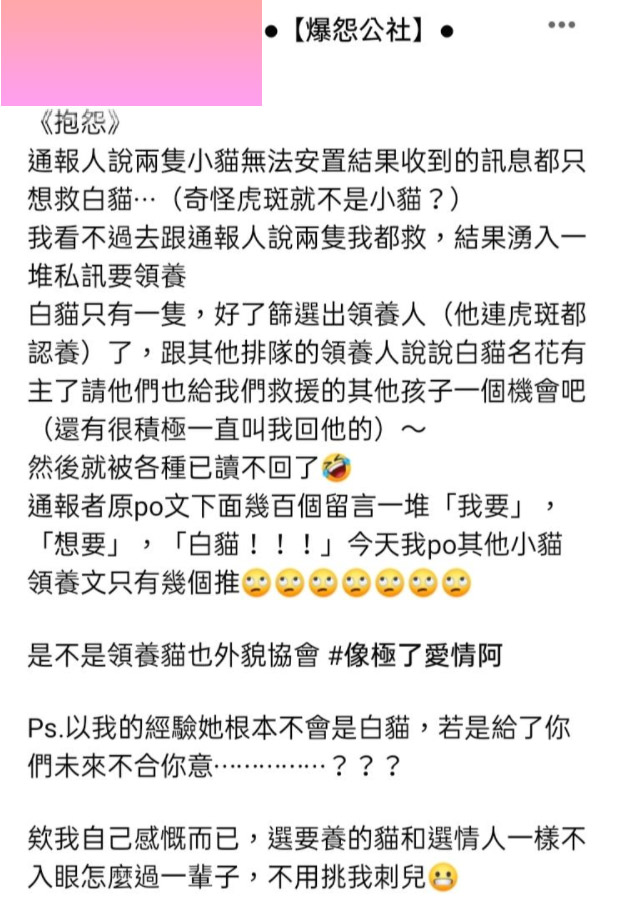 一名網友日前在臉書《爆怨公社》表示:「通報人說兩隻小貓無法安置結果收到的訊息都只想救白貓⋯(奇怪虎斑就不是小貓?)我看不過去跟通報人說兩隻我都救,結果湧入一堆私訊要領養!白貓只有一隻,好了篩選出領養人(他連虎斑都認養)了,跟其他排隊的領養人說白貓名花有主了請他們也給我們救援的其他孩子一個機會吧(還有很積極一直叫我回他的)」,居然就被大家已讀不回,讓她傻眼直呼「是不是領養貓也外貌協會」!