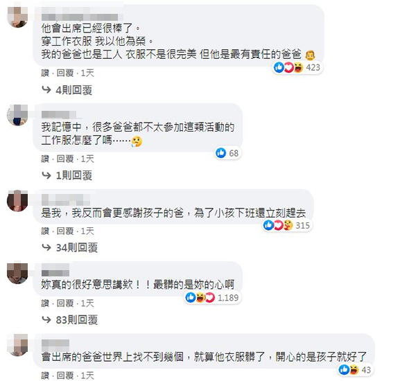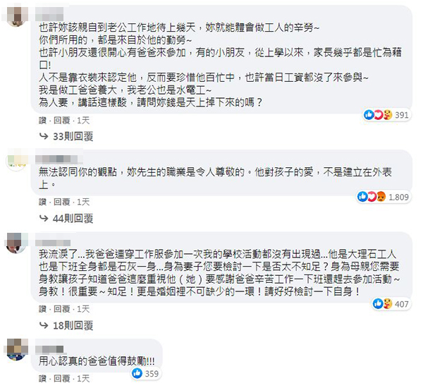 贴文曝光后马上引起热议,网友们指责人妻不应该瞧不起老公的职业,「妳拿他辛苦赚的钱,怎么不嫌脏不拿」、「妳很好意思讲耶!最脏的是妳的心」、「无法认同妳的观点,妳先生的职业是令人尊敬的,他对孩子的爱,不是建立在外表上」,另外也有网友留言支持工人爸爸,「我老公也是做工的,我反而觉得很骄傲」、「这爸爸很棒,工作下班还会赶去参加座谈会,穿着不是重点,心意比较重要」、「穿工作衣服我以他为荣,我的爸爸也是工人,衣服不是很完美,但他是最有责任的爸爸」。