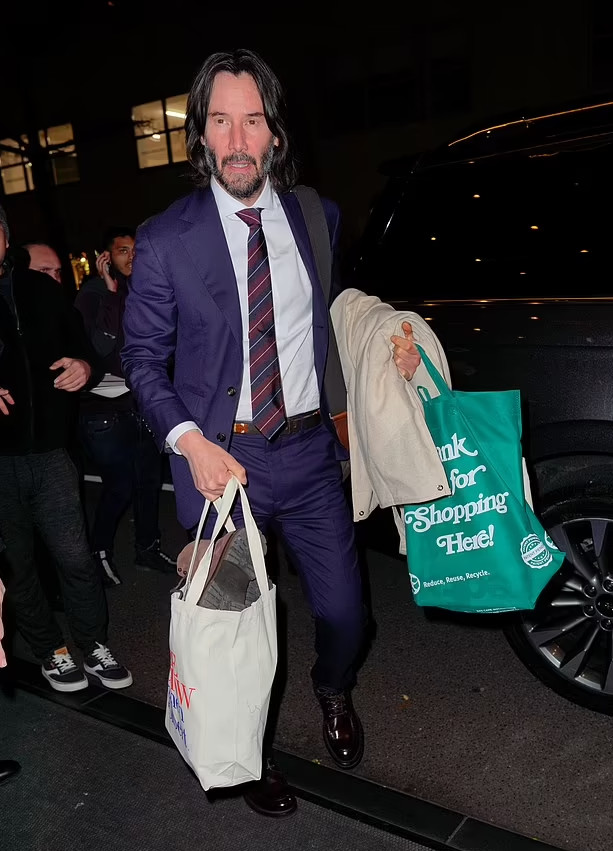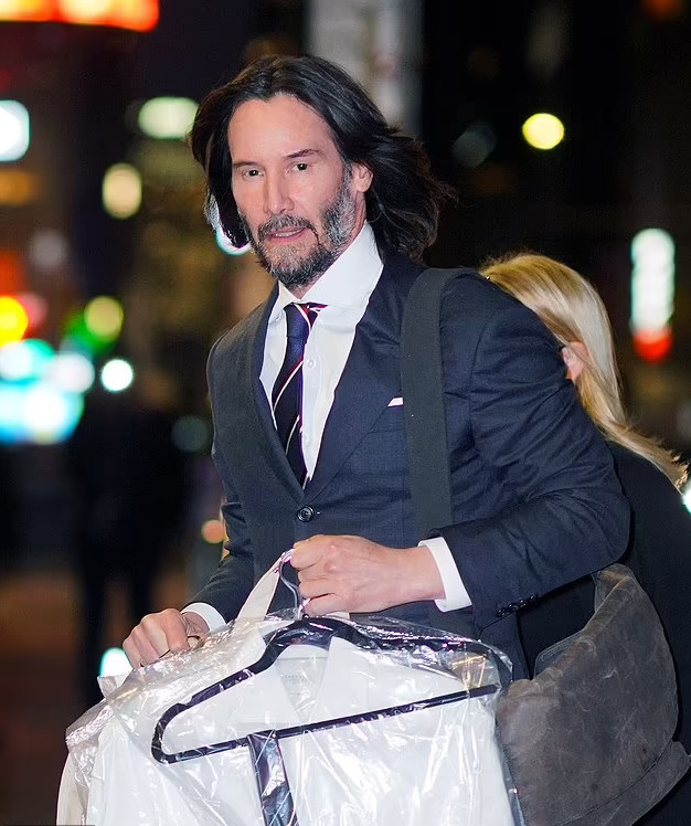 留着招牌中长黑发的基哥身穿合身黑蓝西装搭配条纹领带,放荡不羁的胡型更增添他的男人魅力。稀松平常提着正装西装衬衫的模样,在镜头下却摇身一变成为耀眼的海报。基哥在曼哈顿中城的剧院前下车,迷人风采让前来迎接的粉丝不敢相信他今年已经57岁了。