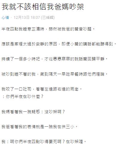 一名网友在网路论坛Dcard上崩溃发文,他半夜4点睡意正浓,突然被爸爸的声音吵醒,爸妈房间不断传出窸窸窣窣的说话声,持续一个多小时才结束,以为是爸妈在吵架。睡到一半被吵醒,他隔天气得找爸妈理论「你们半夜在吵什么?你们半夜四点吵得要死,在吵架喔?」
