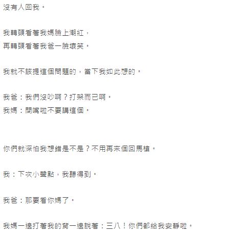 谁知原PO爸妈一脸疑惑「没吵架啊?」随后2人就陷入沉默,妈妈瞬间脸红,还转头看着爸爸坏笑,他顿时明白自己误会大了,尴尬到不行,只好回「下次小声点,我听得到」。不料这时爸爸又来个回马枪「那要看你妈了」,妈妈害羞到狂打他的背。「可怜的我半夜被吵醒,还被放闪,现在还被疯狂揍一顿」。