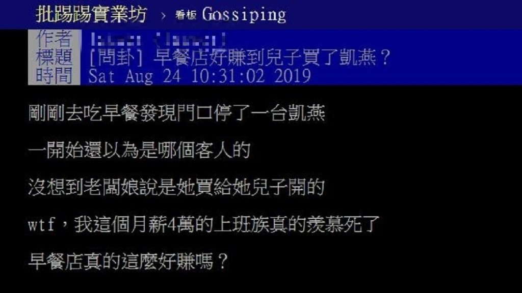 一名網友在網路論壇PTT上發文表示,他到早餐店用餐時,看見門口停了台凱燕 (保時捷休旅車),原本以為是其他客人的,沒想到老闆娘說是她買個兒子開的。這讓身為月薪四萬上班族的他超級羨慕,也好奇「早餐店真的這麼好賺嗎?」