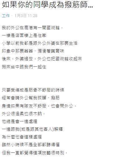 一名男網友在網路論壇Dcard上發文表示,外公在他小時候開了間國術館,每次看到只要有人受傷或筋骨不舒服,外公都會很溫柔幫忙處理,還一邊認真講解,就覺得這項技藝很特別,「看著外公東搞搞、西弄弄,身體就會輕盈很多,雖然不能取代醫療,但是也確實在很多方面滿有幫助」。