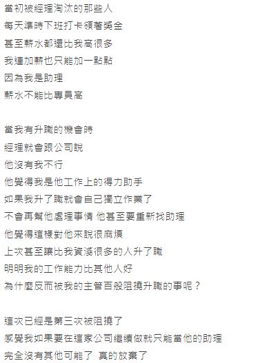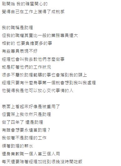 原PO時常要一個人當三個人用,處理本不該屬於她的工作範疇,還每天要陪著經理加班到半夜沒飯吃,表面上看似被重用了,但工作了4年依然只是名「助理」,領著少少的薪水。她曾經提出升職加薪的要求,經理卻表示「助理薪水不能高於專員」,而且要再重新找助理對經理來說很麻煩,很難再找到如此得力的助手。她無奈嘆,「原本覺得這間公司規模蠻大的,應該很有發展空間才待了4年,我值得更好的薪水跟待遇……」