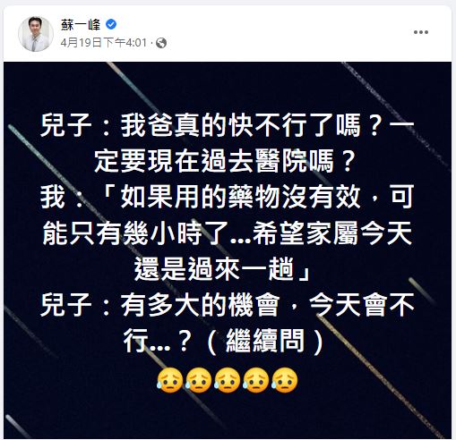 胸腔科醫師蘇一峰在臉書令他感慨不已的病例,一名年邁的老翁病危,他趕緊打電話通知家屬,老翁兒子卻淡定問「我爸真的快不行了嗎?一定要現在過去醫院嗎?」他則解釋「如果用的藥物沒有效,可能只有幾小時了…希望家屬今天還是過來一趟」,沒想到對方竟追問「有多大的機會今天會不行?」幸運的是,老翁在使用藥物後病情大幅改善,甚至有了精神開始認人講話,而後來老翁的一名好友來探望,他才知道了兒子冷漠的原因。