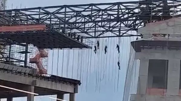 根据外媒《G1》的报导,17日下午,巴西圣保罗一处正在兴建的33层高楼大厦,连接两栋大楼的鹰架突然发生坍塌意外,导致多名正在施工的工人情急之下只能死命抓住绳索以免掉下去。