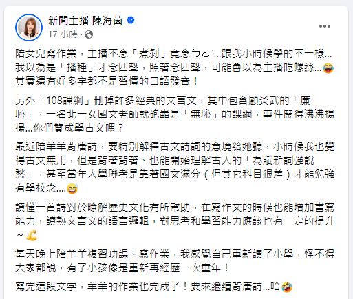 47岁的陈海茵曾是新闻台的当家主播,2020年宣布离开待了20年的主播台,近年来转战网路节目当起旅游生活主持人。婚后育有1女的她时常在社群分享与儿日常,然而就在日前她陪女儿写作业时,惊见主播的「播」字竟然不是唸一声,让当播多年的她震惊不已。