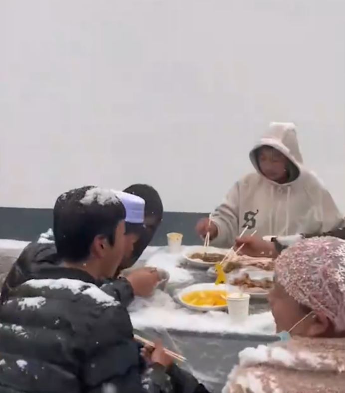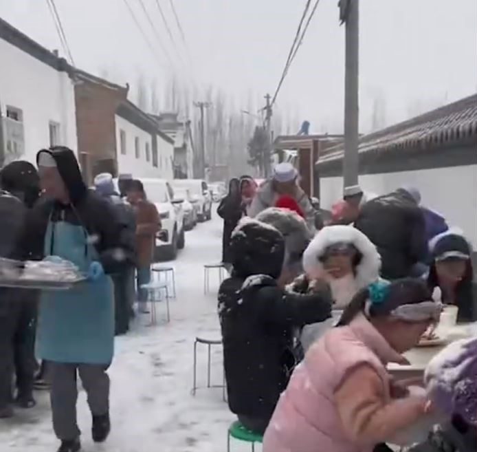 根據中媒《中國網資訊》報導,寧夏回族自治區一戶人家娶媳婦辦流水席,因為當地沒有搭棚子的習俗,所以喜宴是直接露天在街上舉行。當天迎娶時天氣還很好,但喜宴開始後突然下起大雪,已經就坐的來賓們也不慌不忙,穿著厚重的禦寒衣物坐在雪地裡吃飯。