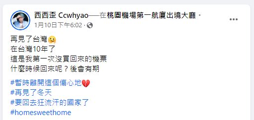 没想到10日,西西歪突然在社群发文表示要离开台湾,并晒出自己人已经在桃园机场的照片,「在台湾10年了,这是我第一次没买回来的机票」,透露自己要回到马来西亚,「暂时离开这个伤心地」。至于何时会回到台湾?他仅表示「后会有期」。