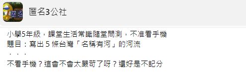一名網友在臉書社團《匿名3公社》上分享了一道國小5年級的生活隨堂考題,在不能使用手機的情況下,「寫出5條台灣『名稱有河』的河流」。結果原PO想破頭還是沒能完整答出,崩潰直呼「不看手機?這會不會太嚴苛了呀?還好是不記分」。