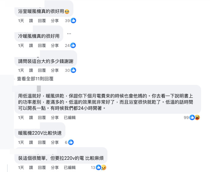 貼文曝光後,許多人都有同感,直呼「浴室暖風機真的很好用」、「冷暖風機真的很好用」、「這台很讚,浴室不再長霉,衣服掛浴室裡還能當除濕室,有能暖房,洗澡不再冷到爆,很推」、「洗完澡拖個地、刮刀刮個水,再開個小電扇,一下子就乾了」、「這幾天冷唧唧,用這個超舒服」、「我家也有裝暖風機,真的冬天需要,浴室也很快乾」。