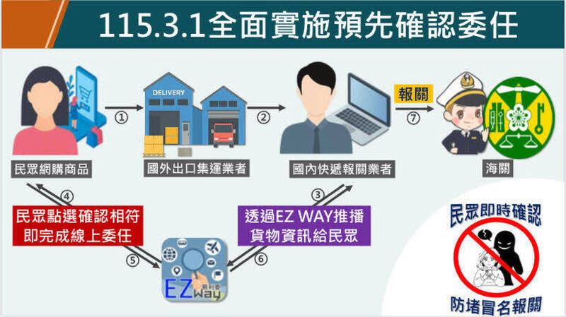 至於何為「預先確認委任」?關務署說明,民眾網購境外貨物後,會先由報關業者透過「EZ Way易利委」APP推播貨物資訊予民眾,經民眾確認與實際購買之貨物相符,並完成線上委任後,再由報關業者辦理後續報關程序。