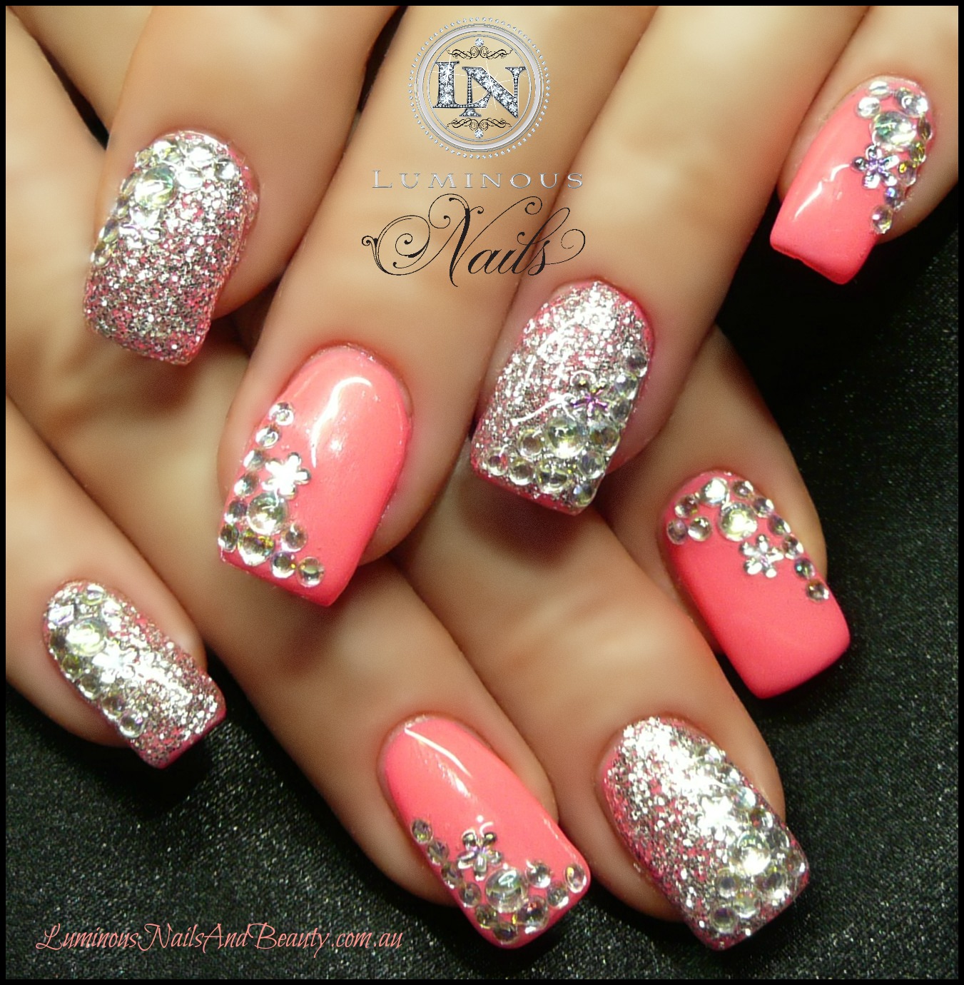 這個作品是採用了Revlon的指甲藝術甲油霓虹系列(Revlon Nail Art Neon)做底,再加上六角形的金色亮片。先排好中間的那排,然後慢慢排出固定的間隔,再用一些Seche Vite速乾的外膜就搞定了。