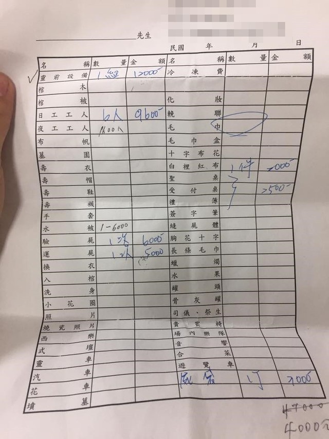 網友對此非常不解,「不到一天的時間就必須要4萬元,光是日工工人,我們見到的只有四位,來跟我們收錢出現了兩位沒看過的,而且我們也沒答應給他們設靈堂,他們就用了,也強迫跟我們收費,希望葬儀社的業者幫我們評估這樣是合理的嗎?」