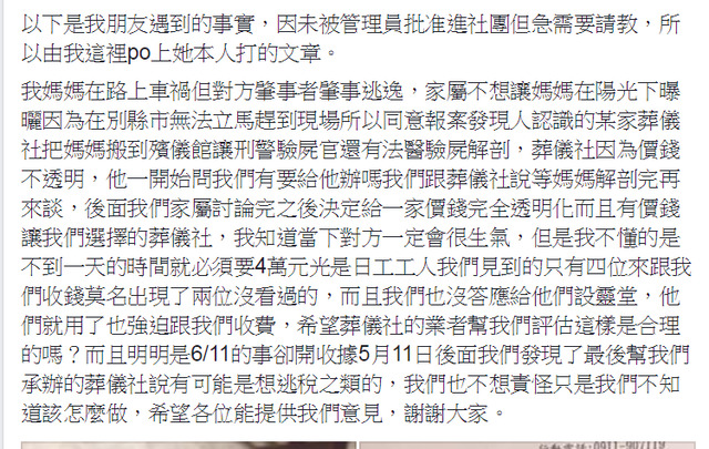 日前有網友代友人在《爆料公社》發文,表示友人媽媽在花蓮因車禍身亡,犯案者肇事逃逸。當家屬知道消息時,友人剛好在外地,來不及馬上趕回來,他們不想母親屍體在太陽下曝曬,於是請發現人委由葬儀社處理。可是這家葬儀社開出的帳單卻讓他們嚇到,「靈前設備1.2萬、日工工人9.6千(6人)、驗屍6千、運屍5千、白裡紅布2千、聖桌受付桌禮簿2.5千、屍袋3千,總計4.1萬元」。