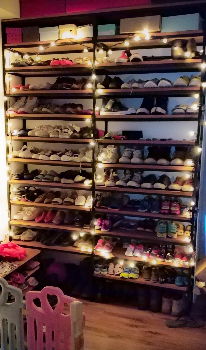 13. 只是面對開放式鞋櫃,有網友詢問是否會有異味,原PO表示住3年多都沒聞到,當初會這樣設計是因為宜蘭濕氣重,有門板的鞋櫃都會讓鞋子或櫃子發霉,目前的鞋櫃雖然整理有些麻煩,但就沒碰上發霉情況。而在味道方面因家裡都是處於開窗通風狀態,所以沒碰過這樣的困擾,這是他們聖誕節時幫鞋櫃裝飾的模樣。