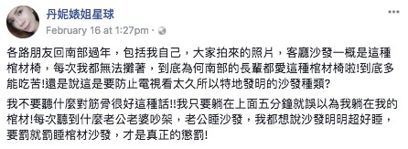 春節期間你有拍什麼照片嗎?今年知名的網路紅人「丹妮婊姐」在臉書上PO文說她回南部過年,但家中的「棺材椅」真的很難坐,好奇的問說:「到底為何南部的長輩都愛這種棺材椅啦!到底多能吃苦!還是說這是要防止電視看太久所以特地發明的沙發種類?」然後還說自己在上面坐了5分鐘感覺就像是在棺材裡一樣。她還開玩笑說:「每次聽到什麼老公老婆吵架,老公睡沙發,我都想說沙發明明超好睡,要罰就罰睡棺材沙發,才是真正的懲罰!」。