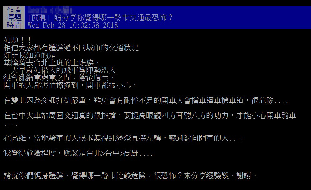 台灣地小車多,摩托車也很多,只要在顛峰時段,一些主要幹道的車流量都會很驚人,上下班更是讓人頭痛。就有網友在《批踢踢》問「請分享你覺得哪ㄧ縣市交通最恐怖?」原PO表示對他來說,「我覺得危險程度,應該是台北>台中>高雄。」他除了舉一些例子之外,也想問問大家的看法,沒想到卻得到不一樣的答案。