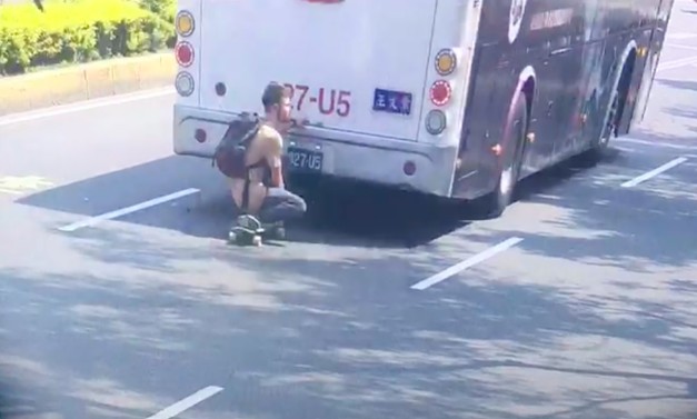 通常人家都是玩遊艇划水,但最近竟然出現有人用公車當遊艇,直接在馬路上上演「公車划水」,一名賴姓網友12日開車時,發現前方有一名外籍男子腳踩著滑板,手拉住公車車尾保險桿,直接在馬路上滑行,畫面令人膽戰心驚。