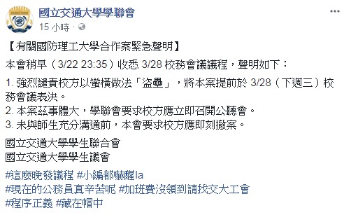 學生議會也一起共同聲明,他們在22日將近凌晨才收到「3月28日的校務會議議程」,但該議程原先是預計在5月才要進行表決,因此讓學生非常傻眼,他們也立刻要求校方召開公聽會、說明會和座談會,把所有事情解釋清楚。