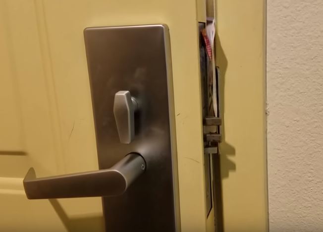 你知道飯店房間上鎖的門有多容易破門而入,連用披薩廣告單都能打開嗎?以下示範給你看 (不鼓勵犯罪喔),先將門鎖和門縫鎖都上鎖: