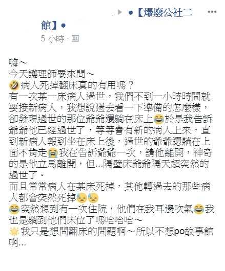 據了解,護理師在「爆廢公社二館」發文表示,有次碰到病人過世,由於不到一小時又有新病人要入住,於是前往關心狀況,沒想到看到的畫面讓他驚呆了!「發現過世的那位爺爺還躺在床上,於是我告訴爺爺他已經過世了,等等會有新的病人上來,直到新病人報到坐在床上後,過世的爺爺還躺在上面不肯走,我再告訴爺爺一次,請他離開,神奇的是他立馬離開,但…隔壁床爺爺隔天超突然的過世了。」護理師指出,常常病人在某床死掉,其他轉過去的那些病人都會突然死掉,這讓他好奇發問「翻床真的有用嗎?」