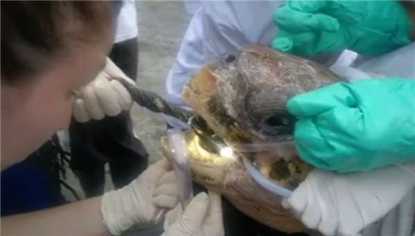 從影片中可見,海洋保育團體利用軟管撬開海龜的嘴巴,並試著拉出牠嘴裡卡住的東西,在過程中可以看到海龜相當的痛苦,感覺眼淚都要流下來了!還好最後他們成功將海龜嘴裡的東西順利拿出來,讓海龜得以鬆一口氣,好好休息。