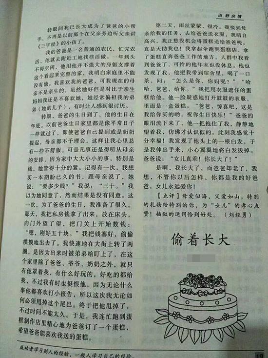 據了解,這名14歲女孩慶慶(化名)在半年前曾經在校刊上發表一篇《偷著長大》的文章,內容在敘述後母對錢管得緊,於是她自己偷偷存錢,給父親買生日蛋糕陪父親過生日的經過,被學校評選為優秀作文,她在文章中提到,她跟後母說要買書一本30元,但後母不同意,為了給爸爸慶生,我把自己偷偷存的錢拿出來,買了一個50元的蛋糕,結果剛好那天後母要我幫父親送衣服,「真是天助我也!」我把蛋糕藏在衣服底下,當爸爸看到蛋糕時,他的眼淚流了下來,一把抱住了她,靜靜地看著她,「此刻我感覺十分幸福!」她小心翼翼地拔掉爸爸頭上的一根白髮,爸爸說,「女兒真乖,你長大了。」慶慶在文末還感嘆地說,她長大了爸爸卻老了,不管以後怎樣,都是女兒的好爸爸,女兒永遠愛他。