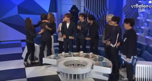 一開始利特問說:「可以坐在這邊嗎?」,沒想到主持人爽快的表示「Sure!」然後一把將利特拉到他的腿上坐好!主持人的熱情讓團員們都嚇呆了。