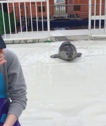 這天肥海豹聽到飼育員在叫他!趕快用肚肚滑行前進,123木頭人~