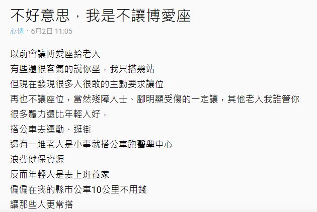 搭乘大眾運輸時,要不要讓博愛座椅給長輩、老人一直是網路上激烈討論的議題,最近在台中有位女大生在Dcard上發表了一篇「不讓座言論」,表示自己一直以來都願意讓位給老人家,但最近的老人卻愈來愈敢要,明明看起來很硬朗還愛硬要位子,加上態度又不好,所以她決定不再讓座位。她的文章貼出後引起許多網友討論。