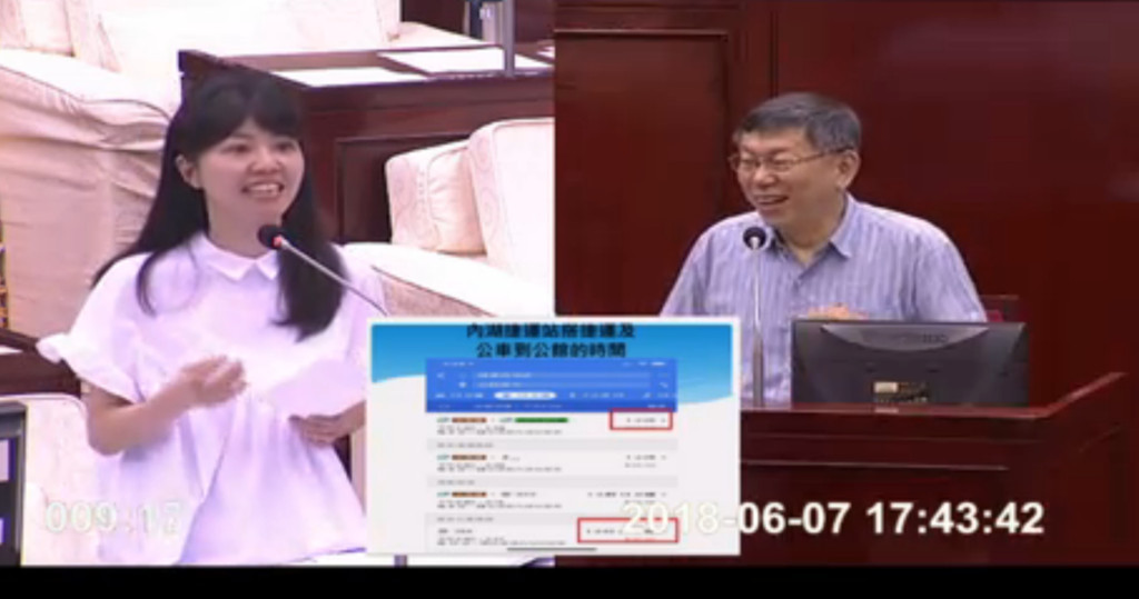 據了解,在定期大會上議員高嘉瑜質詢時表示,從內湖搭公車到台北市政府非常麻煩也很花時間,都要到處繞來繞去才會到,內湖公車的路線整個都很不方便,難怪民眾寧可開車,也不搭公車通勤。高嘉瑜還舉了例子,柯P辦公室的主任,之前住內湖時也有跟柯P反應過交通狀況不佳,「您的兒子是不是也在內科上班?」會不會也覺得交通不便。