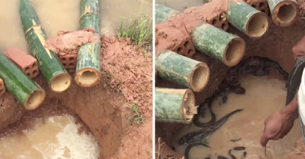 最神捕鱼法!他在池边放竹筒 隔天一打开就是满满的鳗鱼+螃蟹!