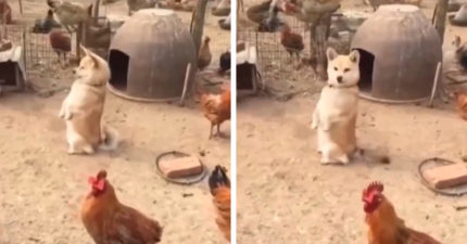 狗兒站雞寮中央 偷瞄旁邊雞喬動作:我也是一隻雞呢(眨眼