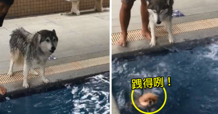 送「旱鴨子二哈」學游泳 不肯游「狂念咒語」看到更小隻跳下去才認命