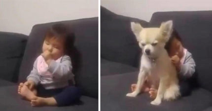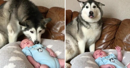 二哈看著寶寶「滿臉無奈」 馬麻走近淚光閃爍:我的墊墊