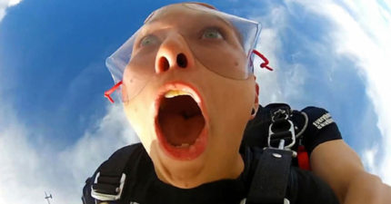 極限辣妹揪帥教練「激情跳傘」,下降不到10秒「噴出」爽臉變臭臉!(影片)