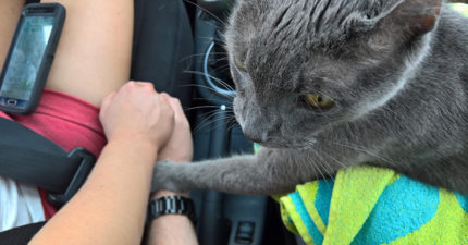 主人開車載「生重病的老貓咪」要去獸醫院安樂死很難過,結果下一秒貓咪輕輕伸出貓掌「握住了主人的手」…