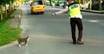 喵皇要過馬路 暖警「肉身護駕開路」:皇上請過!