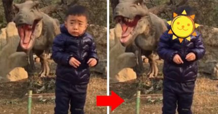 男童站暴龍模型前超怕 爸媽cue拍照「硬出擠苦瓜笑臉」太萌