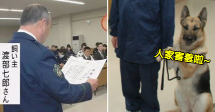 德牧警犬「上台領獎」突然變害羞 牠「雙手握緊緊」連主人也忍不住笑場!