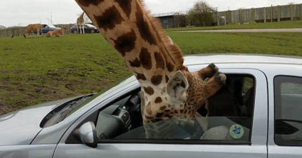 長頸鹿突然「伸入車內」想討食物 下秒車窗玻璃整塊爆開!(影片)